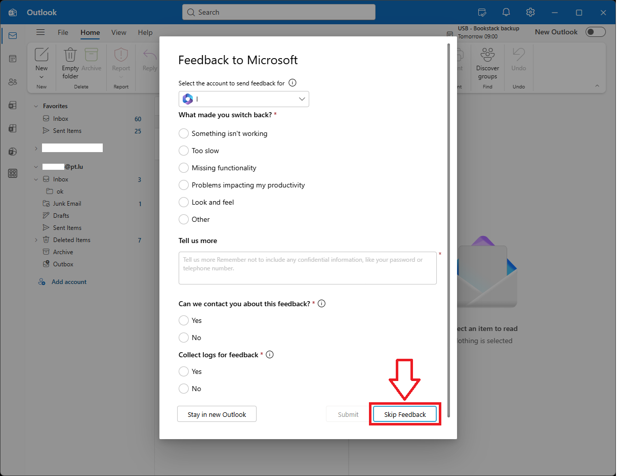 - Klicken Sie unten rechts auf „Feedback überspringen“.
